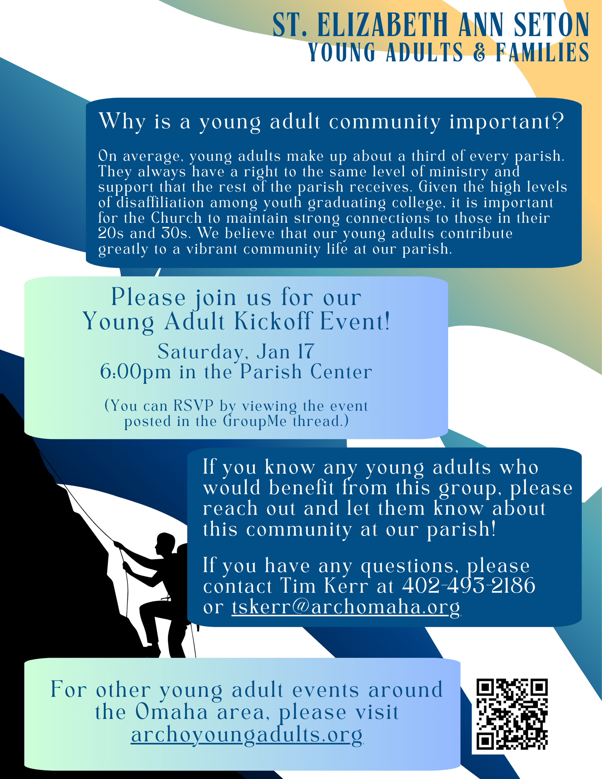 Our parish is looking to start a ministry for young adults between the ages of 20-40. We would like to offer bible studies, faith formation, mentorship, and social activities for young adults in our parish. Young children are welcome at all of our events. To become involved with this group, please contact Tim Kerr, 402-493-2186 ext. 14 or tskerr@archomaha.org.